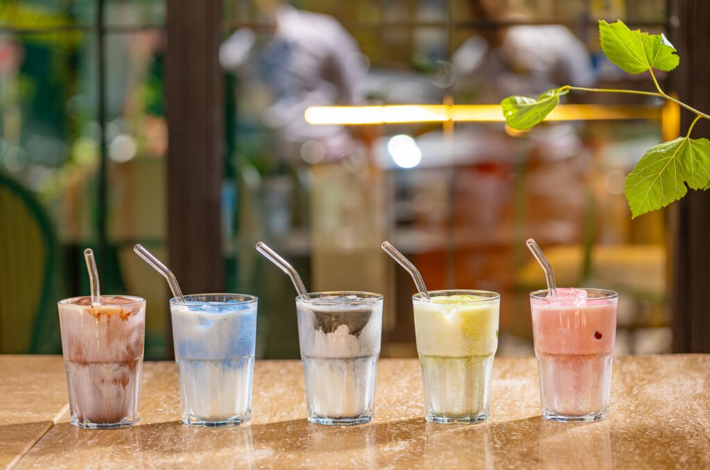 La carte inclut des boissons du monde entier : Matcha Latte japonais, Chai Latte indien, Golden Latte aux épices orientales, cafés italiens, smoothies tropicaux, et thé marocain traditionnel pour l’ancrage local.