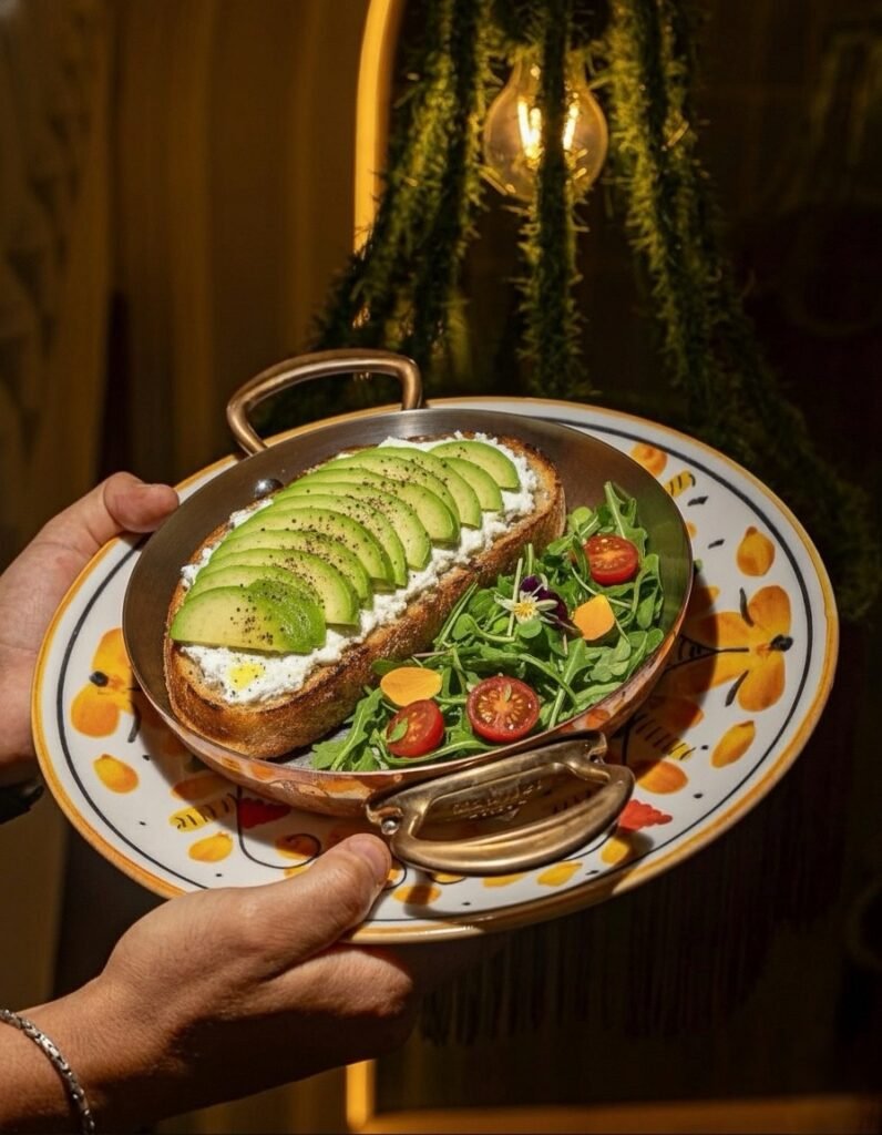Green Garden : pain de campagne grillé, avocat frais écrasé, fromage frais artisanal, herbes du jardin fraîchement cueillies.