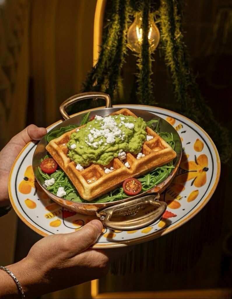 Healthy Gaufre : gaufre dorée maison, purée d’avocat onctueuse, crème citronnée, feta grecque, herbes fraîches.