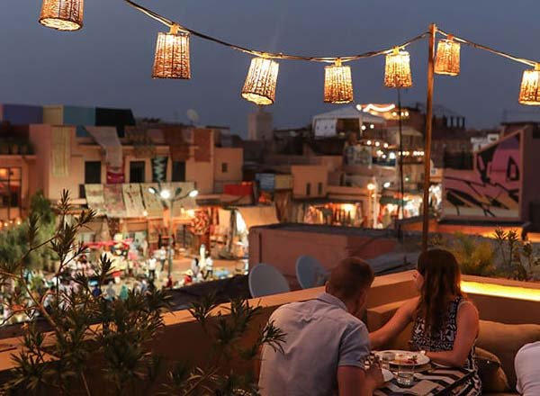 Pour une vue panoramique : Terrasse des Épices ou Nomad — rooftops avec vue sur les souks et les toits de la médina.